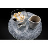 Très jolie forme organique en verre, parsemée d'un décor de zestes de coco. Elégante et magnifique assiette de 24.5 cm qui prendra toute sa place sur une nappe de couleur tranchée et permettra ainsi de faire ressortir son motif léger et subtile. Utilisation garantie lave-vaisselle.