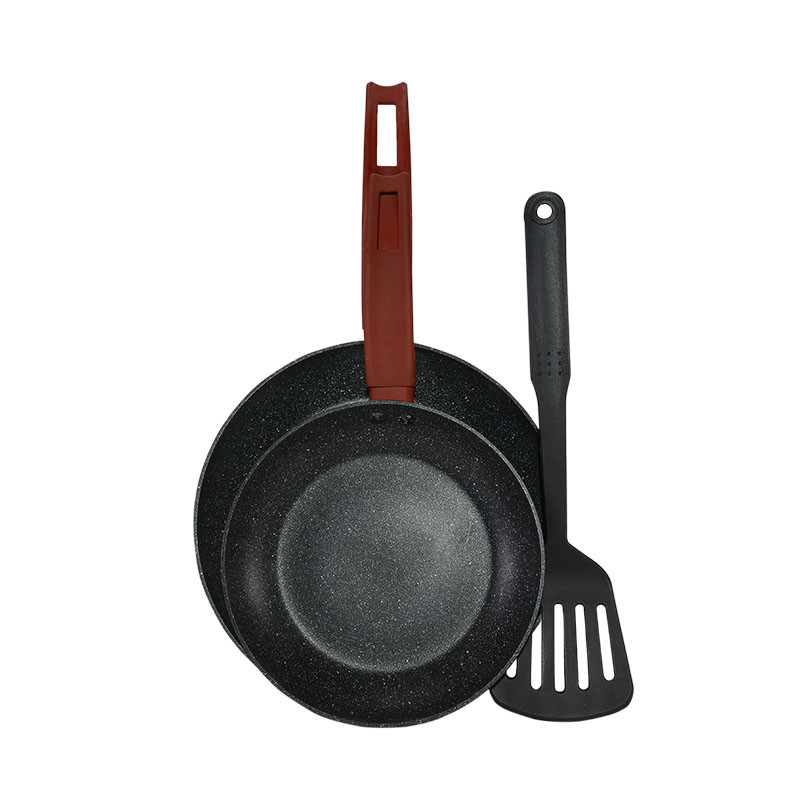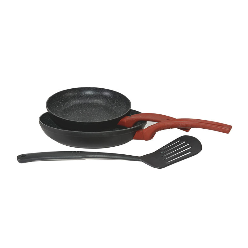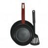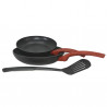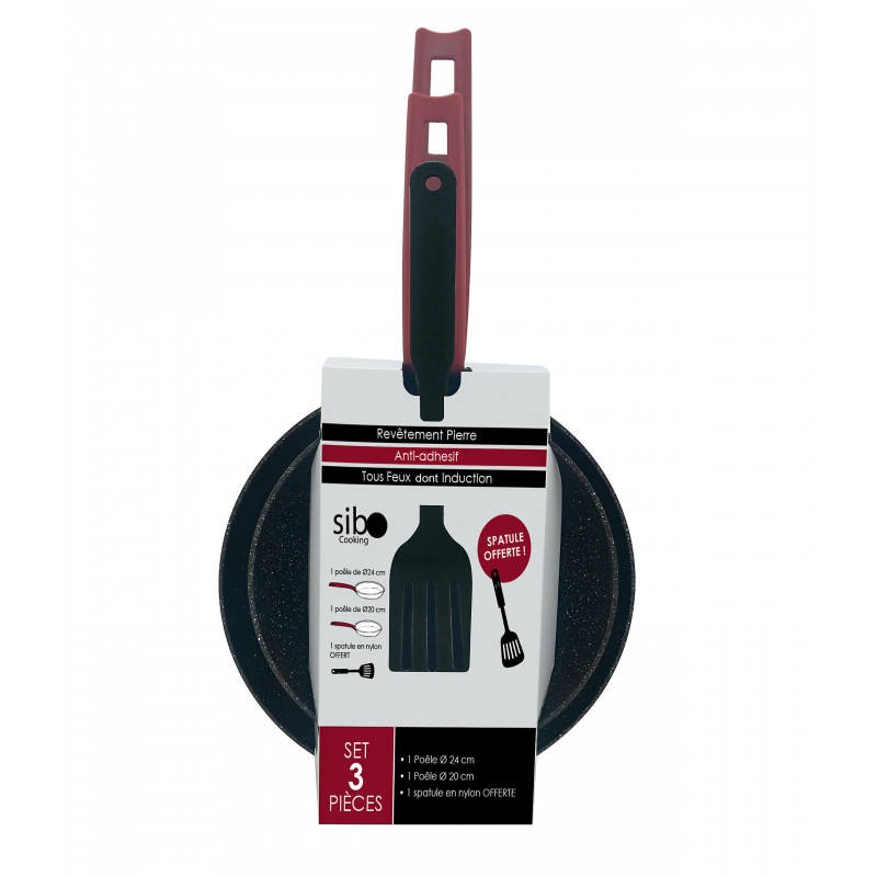 Set 3 pièces composé de 2 poêles en aluminium ø 20 et 24 cm et d'une spatule nylon offerte. Revêtement intérieur anti-adhésif en céramique granité façon pierre marbrée. très bonne résistance aux rayures. Poignées en bakélite rouge ergonomique pour une excellente prise en main. Tous feux dont induction.